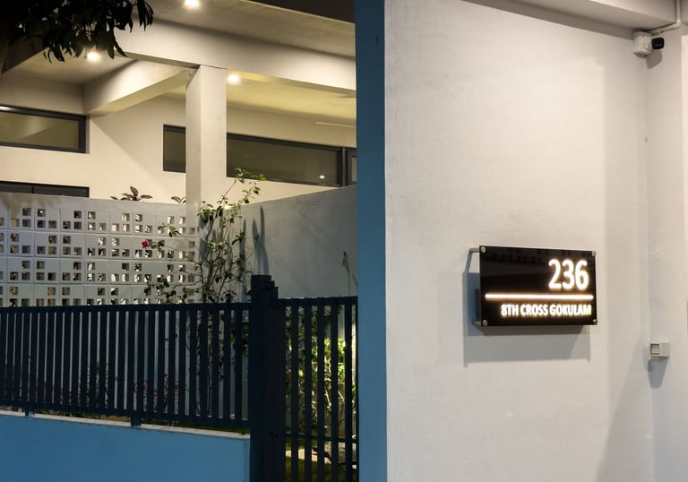 We are located in Gokulam, Mysuru, just hours away from Bangalore, perfect for a peaceful getaway.